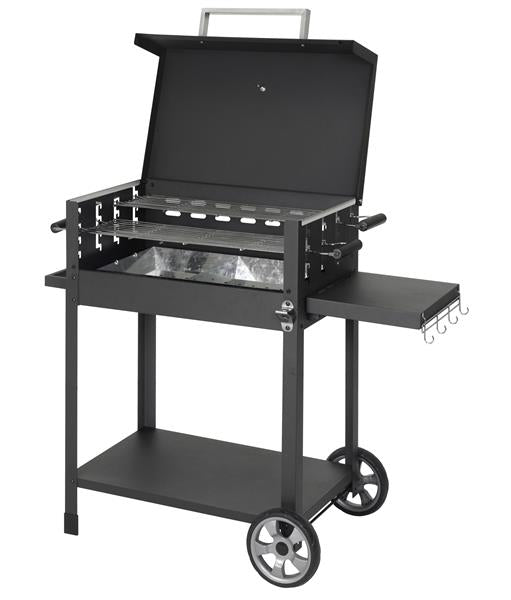 Holzkohle-Grillwagen Aus pulverbeschichtetem Stahl 2 separate, höhenverstellbare Grillroste Seitlich klappbare Seitenfläche mit Hakenleiste Mit Deckel...