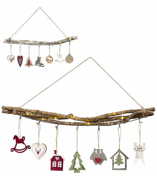 Dieser Deko-Leuchtzweig wird hängend verwendet. An dem Lichterzweig sind 7 verschiedene Anhänger aus Holz angebracht....