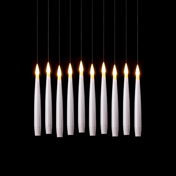 Jede Kerze misst etwa 15,5 cm in der Länge und hat einen Durchmesser von 1,5 cm. Mit dem transparenten Faden, der eine Länge von ca. 150 cm hat, lassen sich die Kerzen ganz einfach aufhängen, wodurch der schwebende Effekt entsteht. Die Steuerung erfolgt bequem über den beiliegenden Zauberstab, der die Kerzen ein- und ausschalten kann.