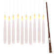 Jede Kerze misst etwa 15,5 cm in der Länge und hat einen Durchmesser von 1,5 cm. Mit dem transparenten Faden, der eine Länge von ca. 150 cm hat, lassen sich die Kerzen ganz einfach aufhängen, wodurch der schwebende Effekt entsteht. Die Steuerung erfolgt bequem über den beiliegenden Zauberstab, der die Kerzen ein- und ausschalten kann.
