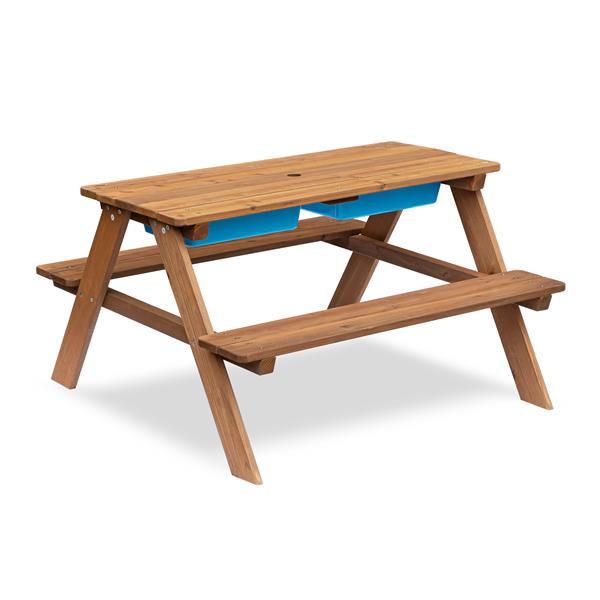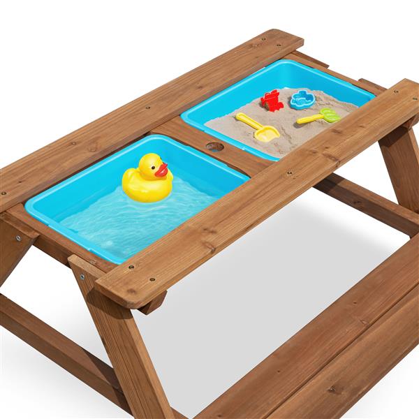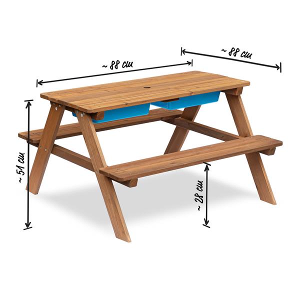 Die Kindersitzgruppe ist multifunktional einsetzbar. Nutzen Sie sie als normale Bank oder verwandeln Sie sie in einen Spieltisch für Sand-, Matsch- und Wasserspiele. Die beiden herausnehmbaren Kunststoffwannen bieten Platz für freudige Sand- und Wasserspiele. Bei Nichtgebrauch können sie einfach abgedeckt werden, wodurch ein normaler Tisch entsteht. Gefertigt aus massivem, lasiertem Holz, ist die Sitzgruppe robust, langlebig und wetterbeständig.