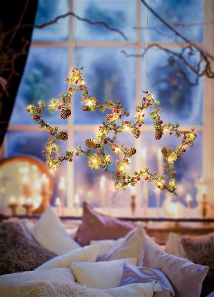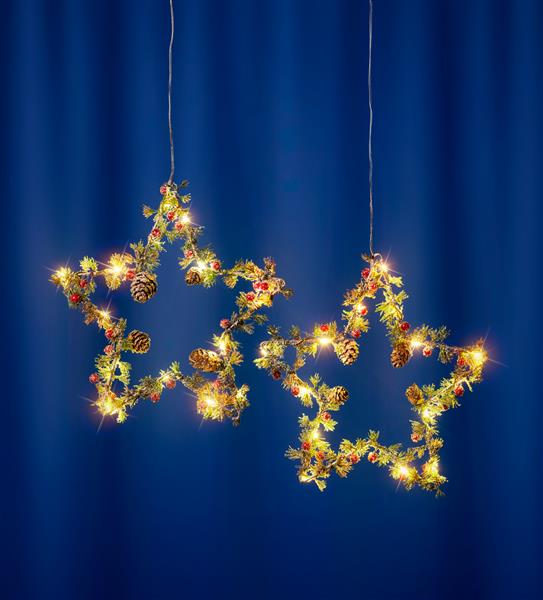 Dieses wunderschöne Set bestehend aus 2 Metall-Sternen zum Aufhängen. Die beiden Sterne sind jeweils mit schneeberieselten Zweigen, roten Früchten und Pinienzapfen bestückt. Neben der winterlichen Dekoration wurden die Sterne jeweils mit einer 15er Lichterkette ausgestattet. Die Lichterkette lässt die Weihnachtssterne im schönen gemütlichen warm-weißen Licht erstrahlen und sorgt so für eine besinnliche Stimmung. Die Stromversorgung erfolgt je über 2x 1,5V AA Batterien (nicht im Lieferumfang)
