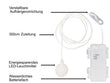 - Am Kabel ist eine praktische verstellbare Aufhängevorrichtung angebracht