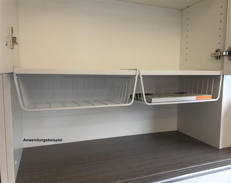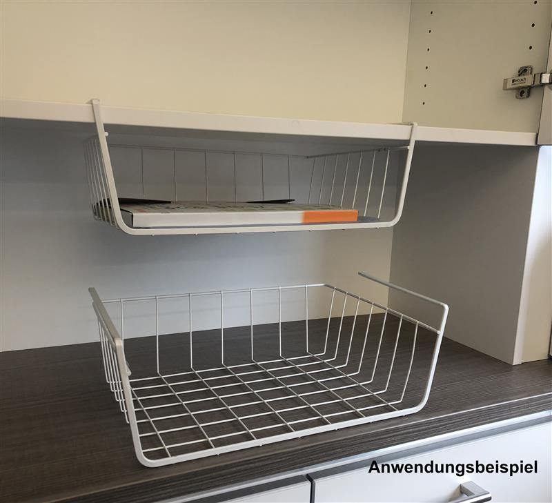 Mit diesen praktischen Hängekorb schaffen Sie ganz simpel zusätzlichen Platz zur Aufbewahrung. Der Regalkorb wird einfach am Regalboden / Brett eingehangen. Kein Bohren und Schrauben notwendig. Dank der Silikonüberzüge an den Haltebügeln wird ein verrutschen verhindert.