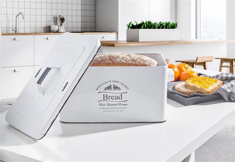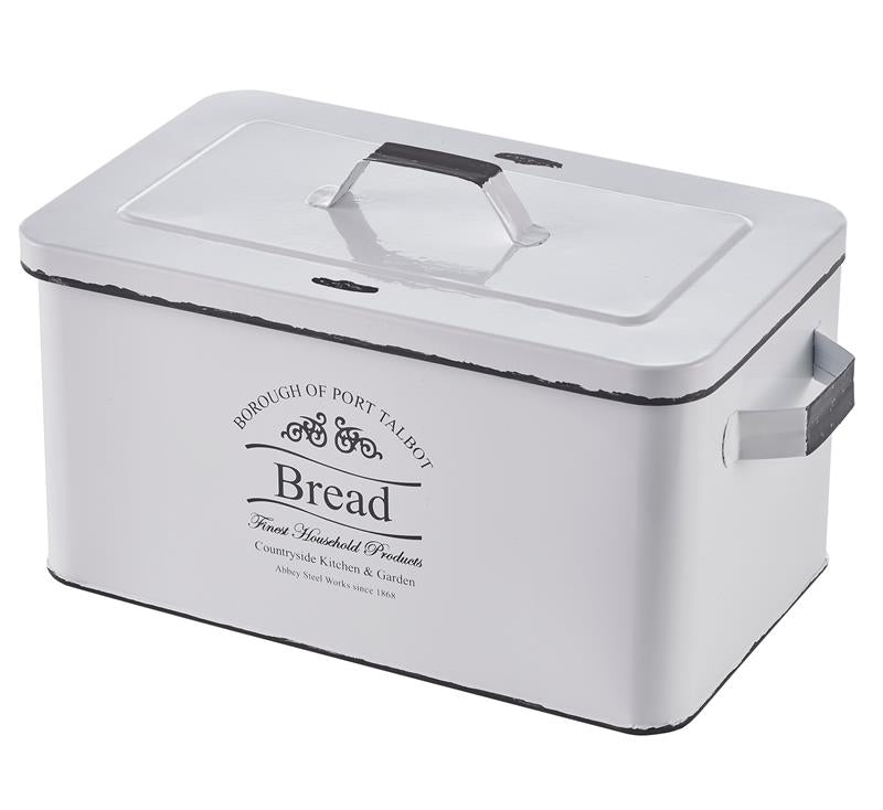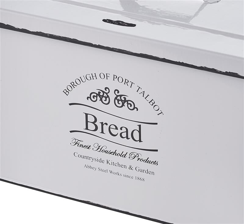 Durch die Form und der zweifarbigen Lackierung (weiß & grau-schwarz) kommt der trendige Retro / Vintage Look zu Stande und fügt sich so perfekt in Ihre Kücheneinrichtung ein. Abgerundet wird der antike Look mit dem schwarzen Aufdruck „BREAD“ auf der Vorderseite. Nicht zuletzt unterstützen auch die kantigen Griffe diesen trendigen Look.