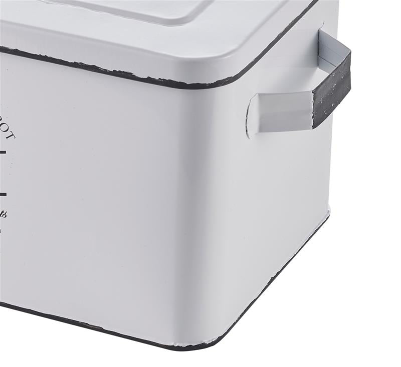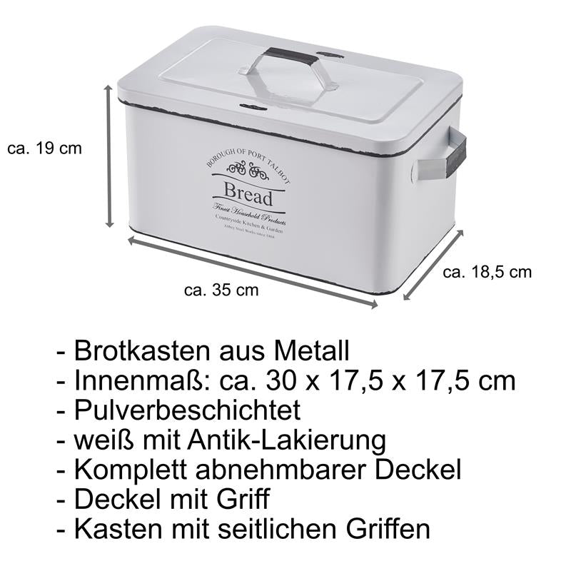 Durch die Form und der zweifarbigen Lackierung (weiß & grau-schwarz) kommt der trendige Retro / Vintage Look zu Stande und fügt sich so perfekt in Ihre Kücheneinrichtung ein. Abgerundet wird der antike Look mit dem schwarzen Aufdruck „BREAD“ auf der Vorderseite. Nicht zuletzt unterstützen auch die kantigen Griffe diesen trendigen Look.