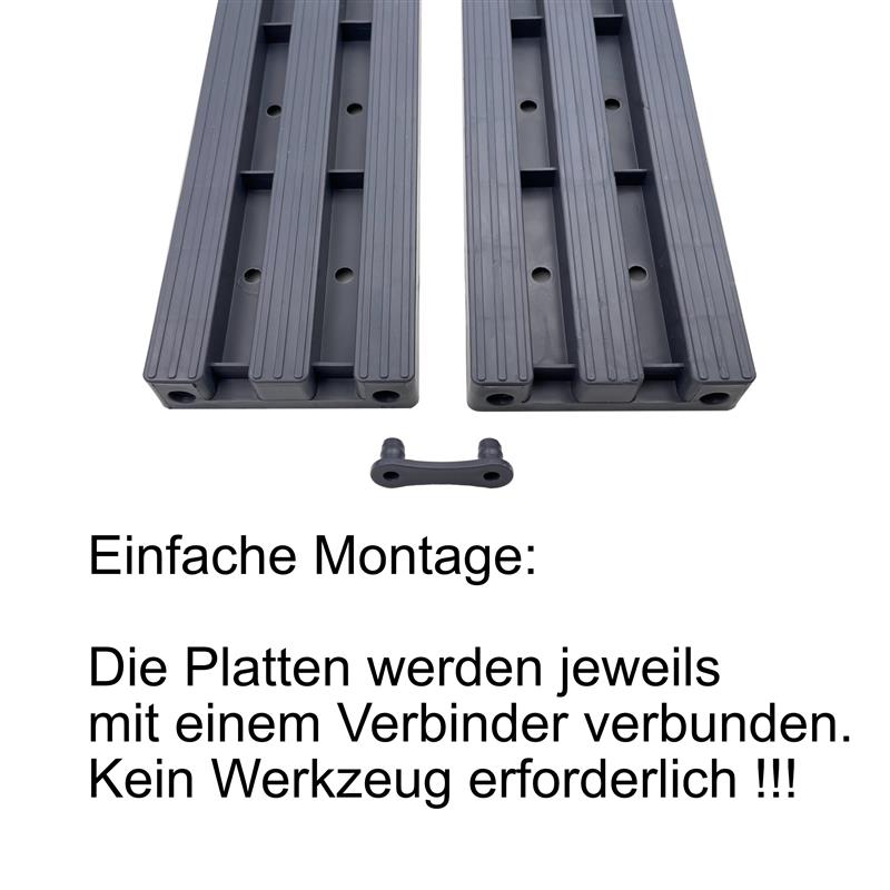 Der Rollweg ist mit wenigen Handgriffen und ohne Werkzeug montierbar. Die einzelnen Platten müssen jeweils nur mit dem Verbinder verbunden werden – fertig.