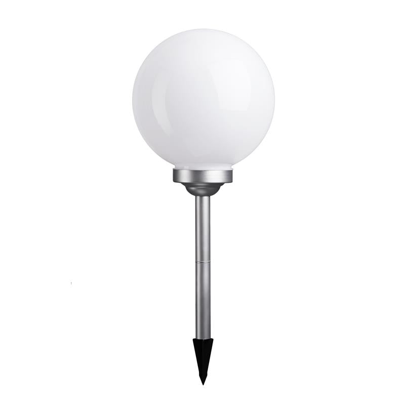 Die Gartenkugel hat einen Durchmesser von 25 oder 30 cm und kann mit den stabilen schwarzen Erdspieß in den Rasen oder ähnliches gesteckt werden.