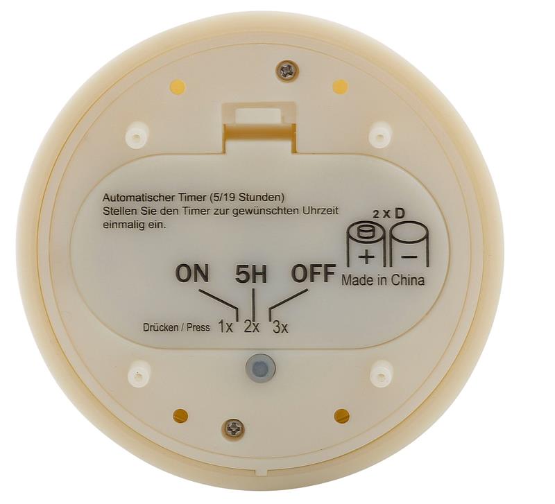 Mit 5/19 Stunden Timer: 5 Stunden leuchtet die Kerze; danach schaltet sie sich automatisch für 19 Stunden aus und danach für 5 Stunden wieder an