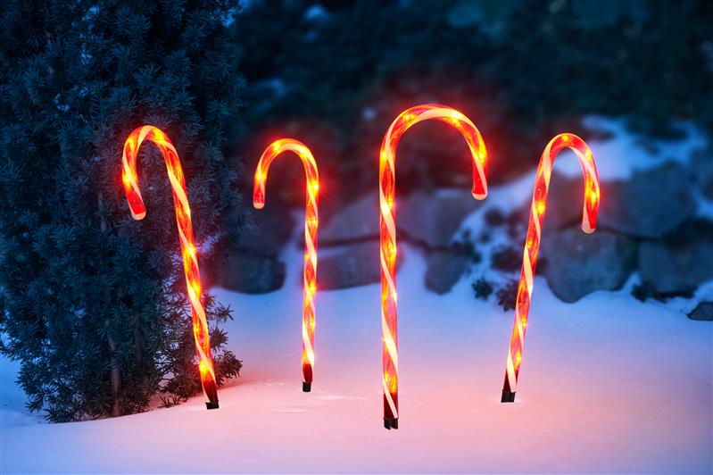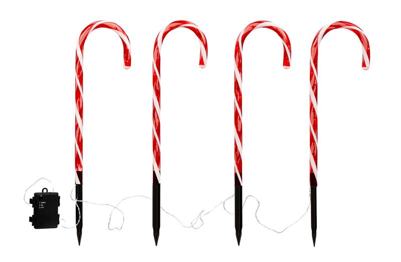 LED Gartenstecker mit 4 Zuckerstangen, beleuchtet mit je 9 warm-weißen LEDs, batteriebetrieben