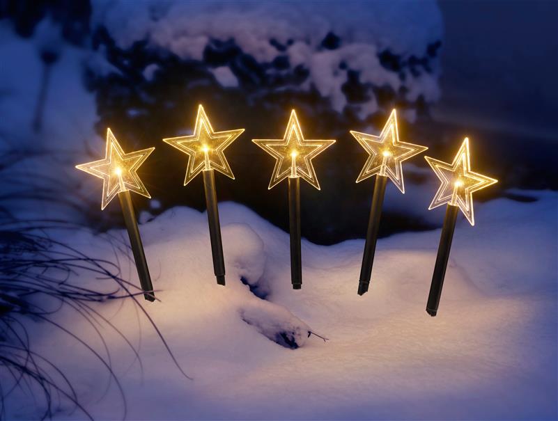 LED Gartenstecker mit 5 Sternen im Acryl-Look, beleuchtet mit je 1 warm-weißen LEDs, batteriebetrieben