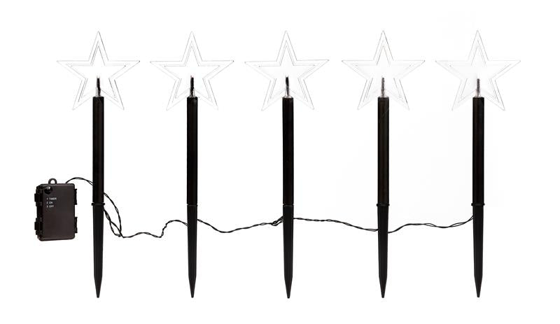 Dieses Set besteht auf 5 Leuchtstäben im Stern Design. Jeder Stern ist mit je 1 warm-weißen LEDs beleuchtet. Der Abstand zwischen den Sternen beträgt ca. 35 cm. Die Stromversorgung erfolgt über 3x 1,5V AA Batterien (nicht im Lieferumfang). Damit die Winterdeko nicht immer eingeschaltet werden muss, haben wir die Weihnachtsdeko mit einem 6 / 18 Stunden Timer ausgestattet. Ist der Timer am wasserdichten Batteriefach aktiviert schaltet sich die Beleuchtung der Stern-Gartenstecker nach 6 Stunden Betrieb für 18 Stunden aus und schaltet sich dann wieder für 6 Stunden ein. Die Höhe der Leuchtstäbe beträgt mit Erdspieß ca. 35 cm. Die Gesamtlänge beträgt ca. 220 cm.