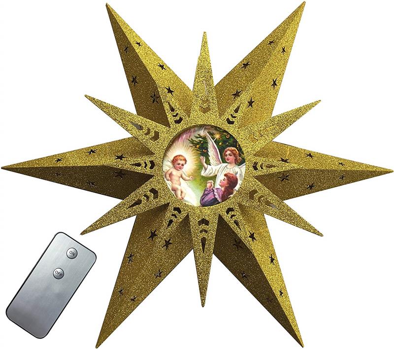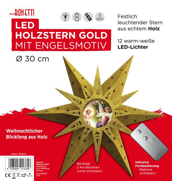 LED Stern aus Holz mit Gold-Glitzer, Ø ca. 30cm, Engel-Motiv, kabellos