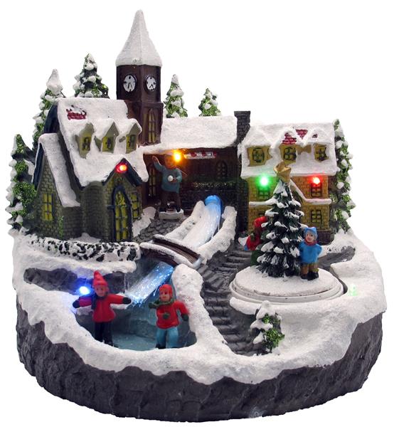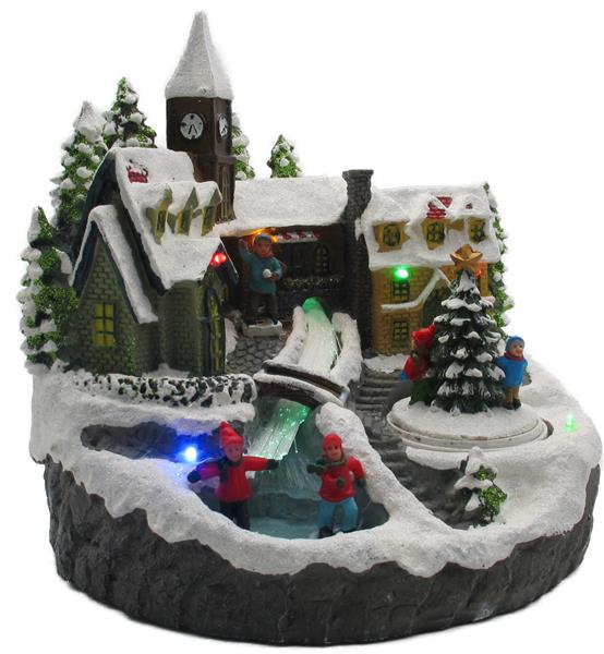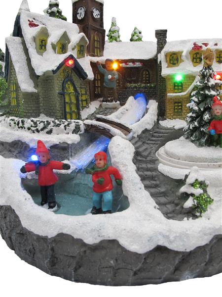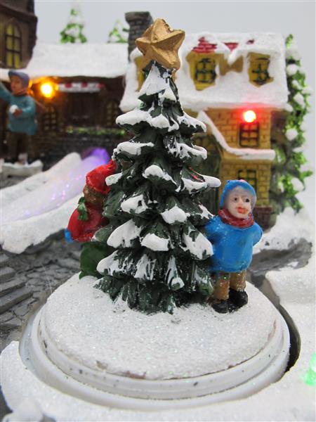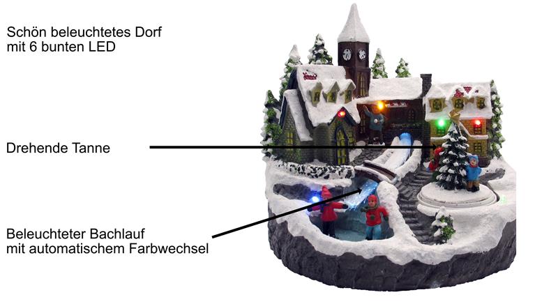 Weihnachtszeit ist Dekozeit - und genau für diesem Zweck ist diese Winterlandschaft perfekt geeignet. Das Lichterdorf zeigt eine idyllische Weihnachtslandschaft mit Menschen und spielenden Kindern. Der Bachlauf ist LED beleuchtet und wechselt harmonisch die Farben. Insgesamt wird das Dorf mit 6 bunten LEDs beleuchtet. Nicht nur die Lichtakzente des Dorfes sind ein Hingucker, sondern auch der drehende Weihnachtsbaum.