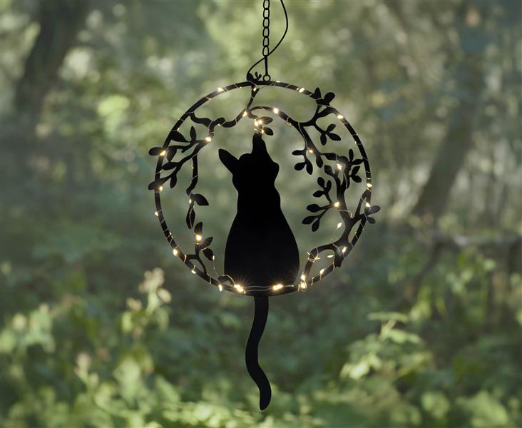 Metall Silhouette Katze mit LED Solar Beleuchtung | 48 warm-weiße LED | inkl. Kette und Haken zum Aufhängen | ca. 68 cm
