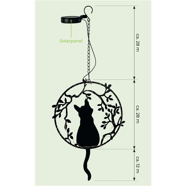 Die wetterfeste Outdoor-Solarleuchte (IP44) ist ca. 68 cm lang und wird mit Kette und Haken zum einfachen Aufhängen geliefert. Das Motiv selbst misst ca. 40 x 28 cm und überzeugt durch sein modernes, zugleich verspieltes Design. Kabellos und solarbetrieben, lädt sich der integrierte Akku (AAA Ni-MH 1,2V, 300 mAh) tagsüber durch Sonnenlicht auf – ganz ohne Batteriewechsel oder Stromanschluss.