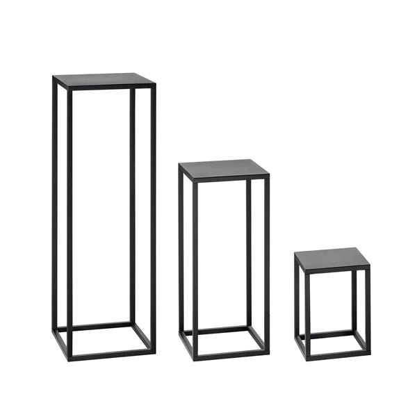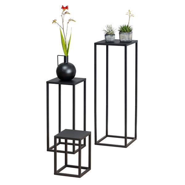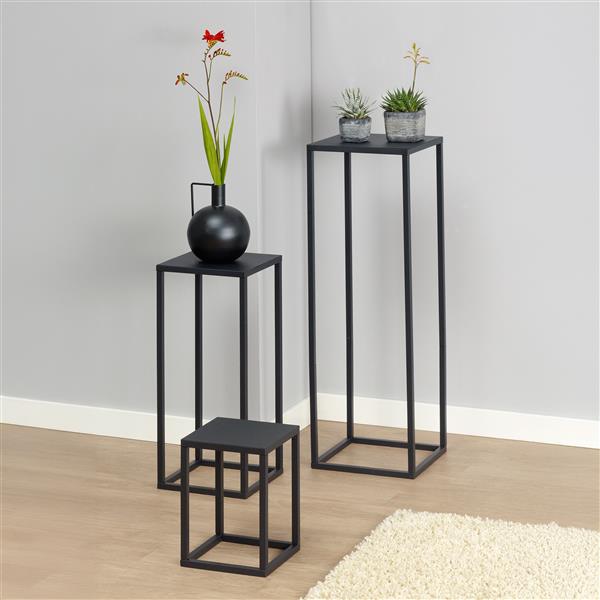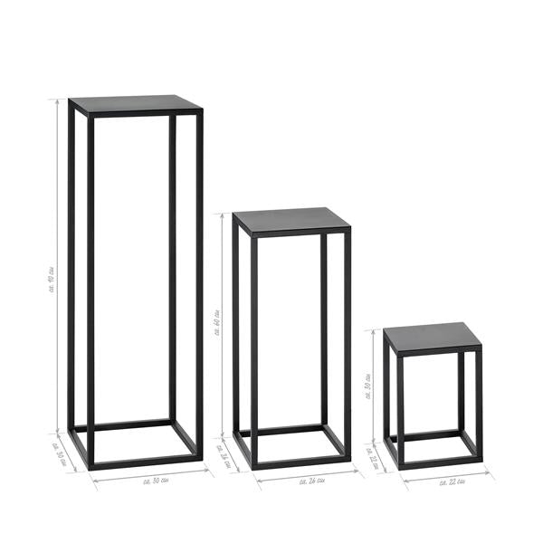 Ob als Blumenständer, dekoratives Regal oder elegante Säule – die drei unterschiedlich hohen Elemente (ca. 30 cm, 60 cm und 90 cm) setzen Pflanzen und Dekoration wirkungsvoll in Szene. Die schwarze Pulverbeschichtung verleiht den Regalen nicht nur eine edle Optik, sondern sorgt auch für eine robuste und langlebige Oberfläche.