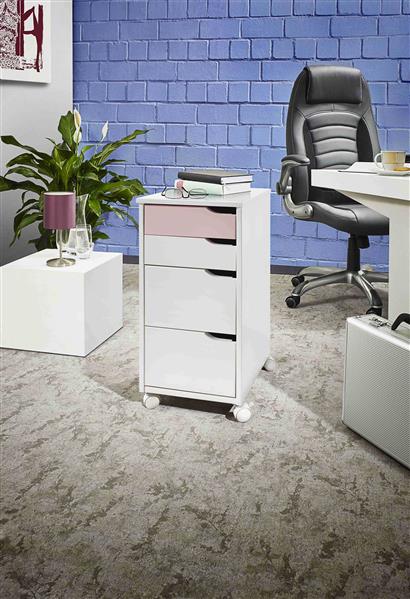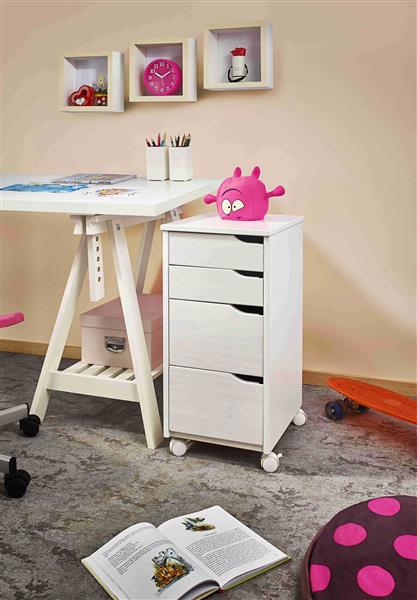 Rollcontainer aus Kiefer-Massivholz mit 4 Schubladen lackiert (weiß-rosa-grau)