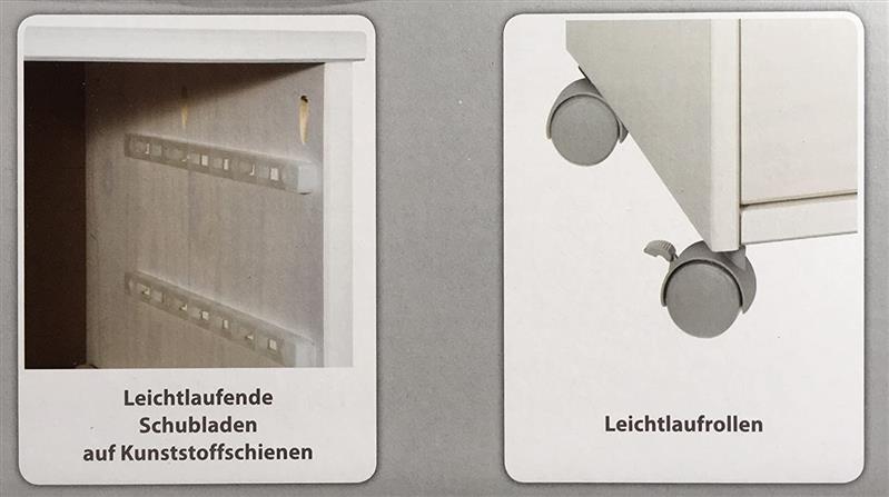 mit 2 zusätzlichen farbigen (rosa und grau) Schubladenfronten zur individuellen Gestaltung des Rollcontainers