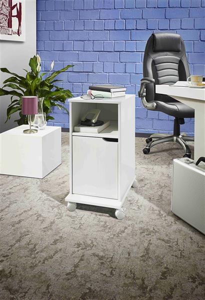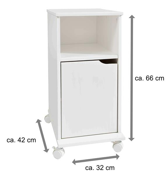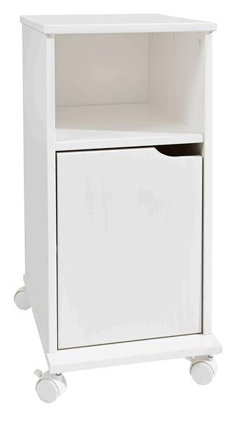 • Rollcontainer aus Massivholz (Kiefer, weiß lackiert) mit 1x Tür und 1x offenen Ablagefach