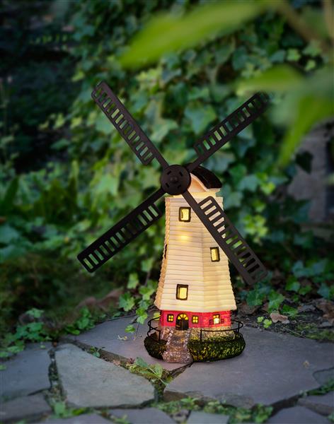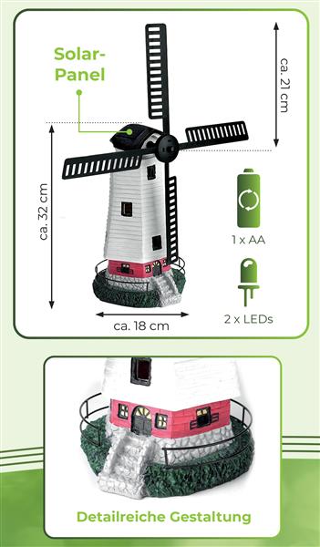 [Blickfang] – Sie möchten mit wenig Aufwand ein Highlight in Ihren Garten zaubern? Dann ist unsere Windmühle mit Licht genau das richtige. Ganz egal ob im Garten, auf der Terrasse, auf dem Balkon, im Beet zwischen den Blumen oder toll in Szene am Teich gesetzt, unsere Solar LED-Windmühle wird mit ihren ca. 53 cm und detailgetreuen Design zu einem Blickfang. Ganz egal ob am Tage, wenn sich die Windmühle dreht oder im Dunklen wenn die beiden warm-weißen LEDs den Innenraum der Windmühle beleuchten.