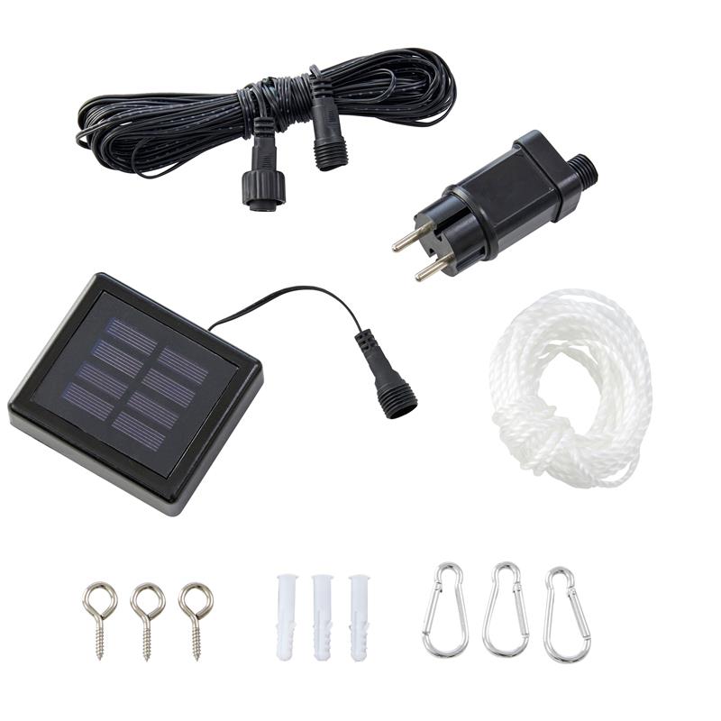 In dem Sonnenschutzsegel ist eine 110er LED Mikro Lichterkette verbaut. Die Lichterkette kann mit dem beiliegenden Solarpanel oder alternativ mit dem IP44 Netzstecker betrieben werden. Die Lichterkette leuchte warmweiß. Die Beleuchtung verfügt über drei Lichtfunktionen. Es kann der Modus Dauerlicht (100 LEDs), Blinken und die Funkelfunktion gewählt werden. In der Funkelfunktion leuchten 100 LEDs permanent und 10 LEDs blinken. Zudem verfügt das LED-Sonnensegel über einen Dämmerungsschalter. Dadurch schaltet sich das Segel bei Einsetzten der Dunkelheit von selbst ein (im Solarbetrieb).