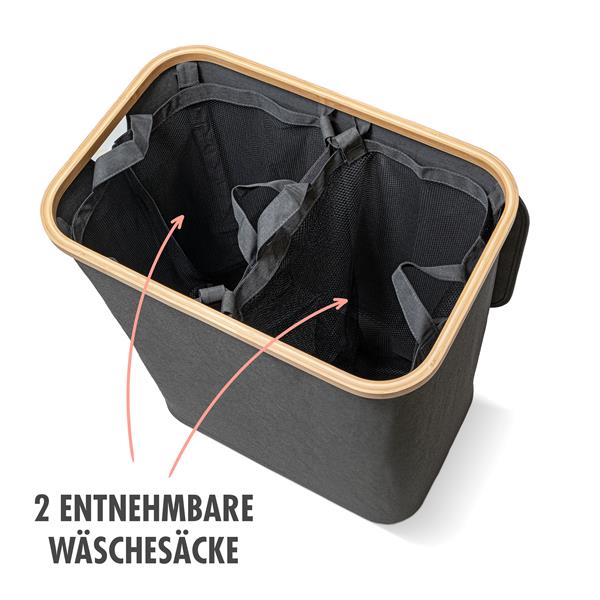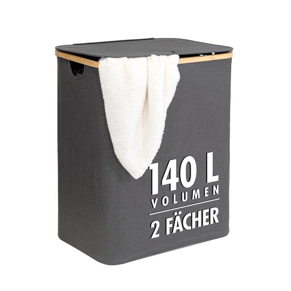 Wäschekorb | 140 Liter | 2 Fächer | mit Deckel und Bambus-Rahmen | Wäschesammler mit 2x Wäschesack zum herausnehmen | grau-anthrazit | ca. 57x37,5x67 cm | faltbar