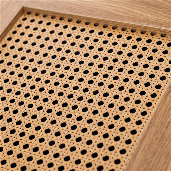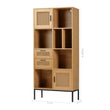 Dieses moderne Wohnregal vereint die Funktionalität eines Schranks mit der offenen Eleganz eines Regals. Die Kombination aus natürlicher Rattan-Optik, stabilem Metallgestell und MDF-Holz macht es zu einem stilvollen Blickfang in jedem Wohnraum.