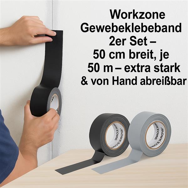 Das Workzone Gewebeklebeband im 2er Set überzeugt durch seine vielseitige Einsetzbarkeit und besonders starke Klebekraft. Mit einer Breite von ca. 50 cm und einer Länge von jeweils 50 Metern pro Rolle eignet sich dieses robuste Klebeband hervorragend für zahlreiche Anwendungen im Innen- und Außenbereich. Ob beim Heimwerken, auf der Baustelle, im Lager oder bei Renovierungsarbeiten – das hochwertige Gewebeklebeband haftet zuverlässig auf verschiedenen Untergründen, darunter glatte, raue und leicht unebene Flächen.
